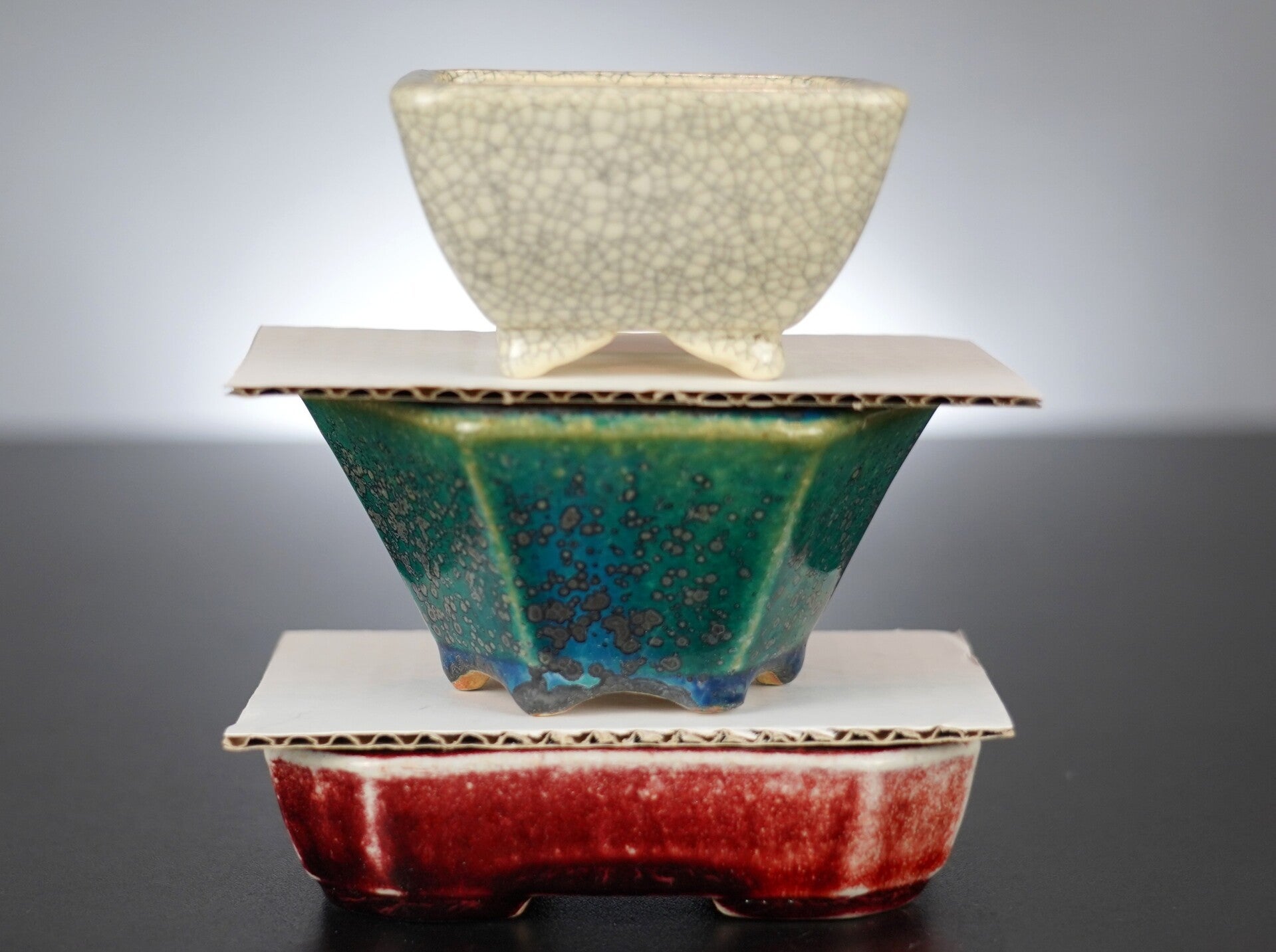 3er Set Bonsai Schale Koyo Tokoname JapanLänge: 1) 11 cm 2) 9,5 cm 3) 7,5 cmBreite: 1) 9 cm 2) 9,5 cm 3) 7,5 cmHöhe: 1) 3 cm 2) 5 cm 3) 4 cmArtikelnr. JB092